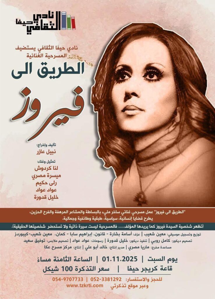 نادي حيفا الثّقافيّ يستضيف المسرحيّة الغنائيّة: “الطريق إلى فيروز”، وذلك بتاريخ 01.11.2025، السّاعة الثّامنة مساء، في قاعة كريجر- حيفا.