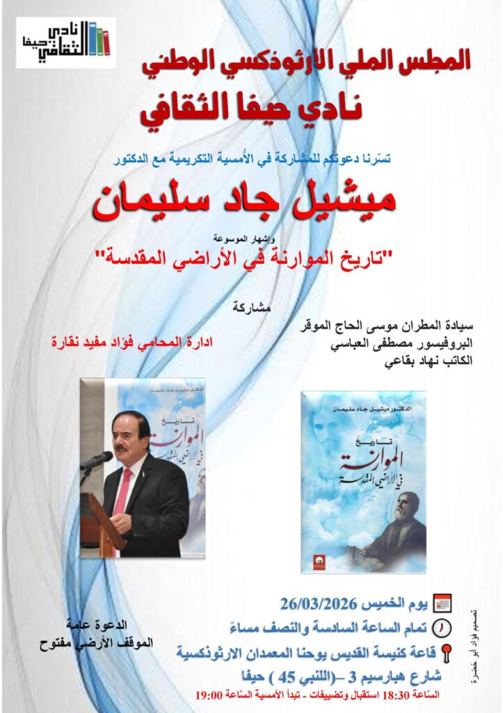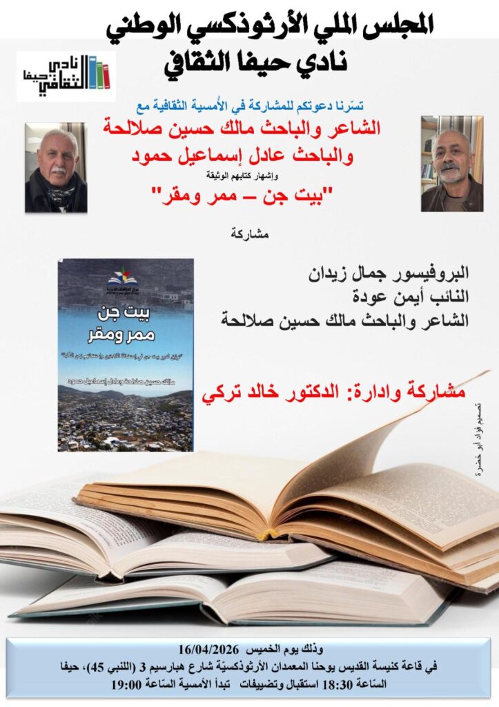 بكلّ مودّة وتقدير، يتشرّف نادي حيفا الثّقافيّ بدعوة روّاده الأوفياء، وأصدقائه من المثقّفين والمبدعين، وكلّ شغوف بالمعرفة، لحضور سلسلة من الأمسيات والنّدوات الثّقافيّة الاستثنائيّة.