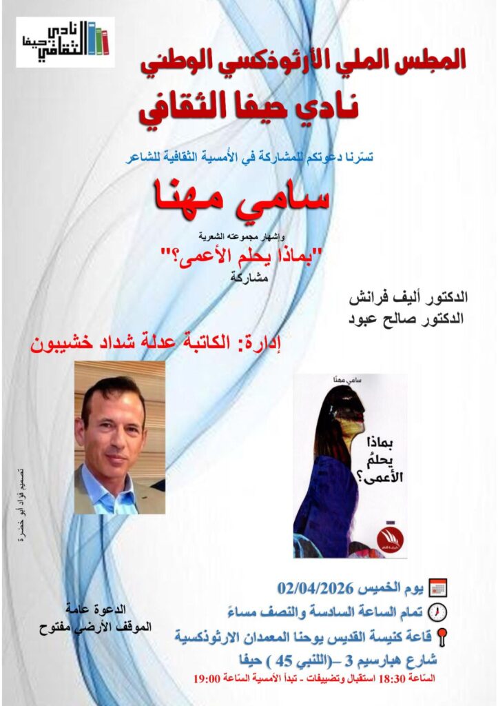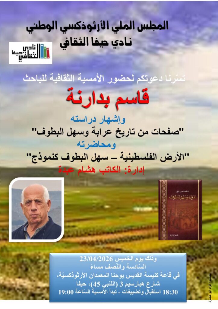 بكلّ مودّة وتقدير، يتشرّف نادي حيفا الثّقافيّ بدعوة روّاده الأوفياء، وأصدقائه من المثقّفين والمبدعين، وكلّ شغوف بالمعرفة، لحضور سلسلة من الأمسيات والنّدوات الثّقافيّة الاستثنائيّة.