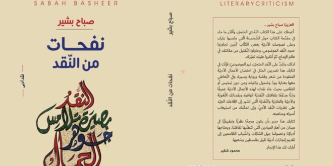 21.08.2025- حيفا، نابلس: بالتّعاون بين نادي حيفا الثّقافيّ ودار الشّامل للنّشر والتّوزيع، صدر كتاب “نفحات من النّقد” للأديبة والنّاقدة صباح بشير. يقع الكتاب في (348) صفحة من القطع الكبير، وقد تولّى مهمّة تصميمه سمير حنّون، ويحمل غلافه الأوّل لوحة من إبداع الفنّان الحروفيّ كميل ضوّ، أمّا الغلاف الأخير فهو مُتوَّج بكلمة للأديب الكبير محمود شقير، الّذي أشاد بمحتوى الكتاب وقيمته …