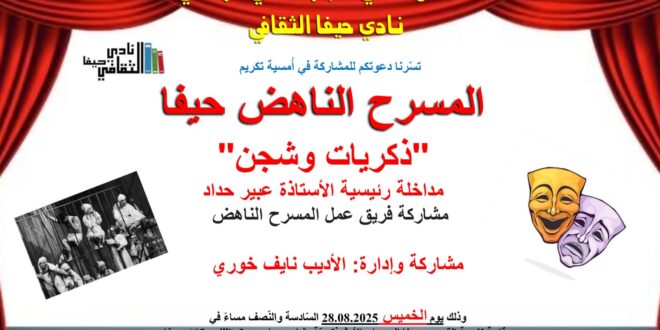 تتشرّف إدارة نادي حيفا الثّقافيّ بدعوتكم لحضور سلسلة من الأمسيات الثّقافيّة والأدبيّة الثريّة. تتضمّن هذه الأمسيات مجموعة مختارة من الفعاليّات التي تسعى إلى إثراء المشهد الثّقافيّ والأدبيّ، وتقديم محتوى قيّم يلبي تطلّعات جمهورنا الكريم. ندعوكم لتكونوا جزءًا من هذه الفعاليّات الّتي تقام حرصا على تعزيز الحوار الفكريّ وتبادل المعارف. كونوا معنا في الموعد المحدّد، فبكم يكتمل حضورنا وتزهو لقاءاتنا. نرحب …