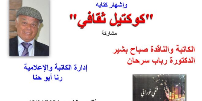 أكمل القراءة »دعوة المجلس الملّي الأرثوذكسيّ الوطنيّ نادي حيفا الثّقافيّ تسرّنا دعوتكم للمشاركة في الأمسية التكريميّة الإحتفاليّة بالأستاذ الأديب: فتحي فوراني وإشهار كتابه: “كوكتيل ثقافي” مشاركة: الكاتبة والنّاقدة صباح بشير، د. رباب سرحان، وإدارة الكاتبة والإعلاميّة رنا أبو حنّا. وذلك يوم الخميس الموافق (18.04.2024)، الساعة السّادسة والنّصف مساء، في قاعة كنيسة القدّيس يوحنّا المعمدان الأرثوذكسيّة. معرض لوحات فنّيّة للفنّانة التشكيليّة: فاتن حمادة …