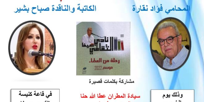 نادي حيفا الثّقافيّ يدعوكم نادي حيفا الثّقافيّ للمشاركة في سلسلة من الأمسيات المميّزة التي تُثري العقل والروح. الأمسية الأدبية مع الأديب الكبير د. واسيني الأعرج وإشهار روايته “عازفة البكادلّي”. مشاركة: النّاقد د. نبيه القاسم، الكاتبة والنّاقدة صباح بشير. إدارة د. ماجد خمرة. الأمسية الثّقافيّة مع الشّاعر د. منير توما وإشهار كتابيه: “رؤى فكريّة وأدبيّة” و “دراسات وترجمات …