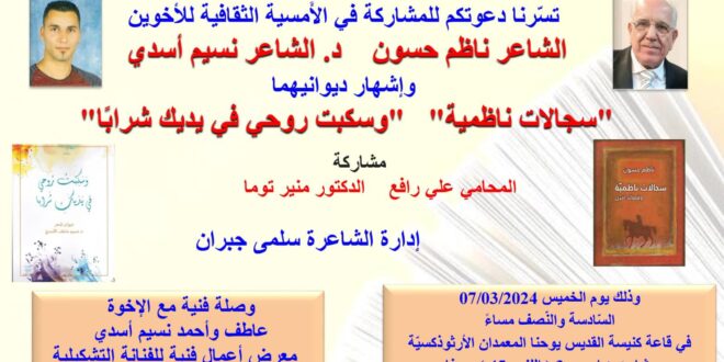 أكمل القراءة »أمسية تكريميّة للشّاعر وهيب نديم وهبة والكاتب الإعلامي نايف خوري في نادي حيفا الثّقافيّ في قاعة كنيسة يوحنّا المعمدان الأرثوذكسيّة، وبرعاية المجلس الملّي الأرثوذكسيّ الوطنيّ في حيفا، أقام نادي حيفا الثّقافيّ أمسية تكريميّة للشّاعر وهيب نديم وهبة، والكاتب الإعلامي نايف خوري، وذلك بتاريخ (25.01.2024)، تمّ فيها إشهار كتاب “سيأتي الضّياء” للضّيفيّن الكريمين. افتتح الأمسيّة مدير النّادي الأستاذ فؤاد مفيد …